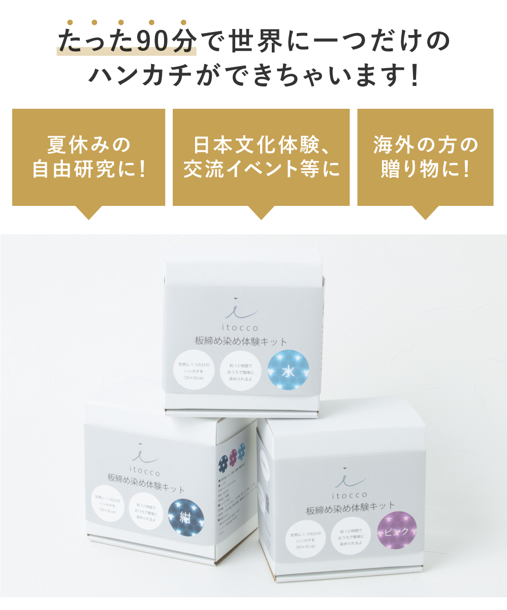 板締め染め体験キット 染め体験 ハンドメイド ハンカチ itocco 染色 染料 ブルー ピンク ネイビー 水色 紺 伝統工芸 絞り染め 簡単 おうち時間 自由研究 夏休み 子供 親子で楽しめる