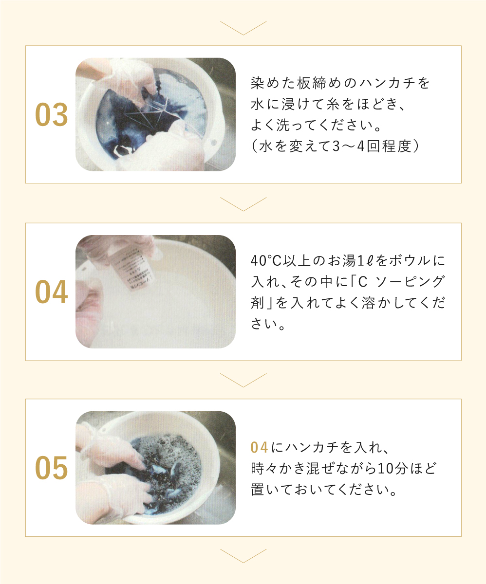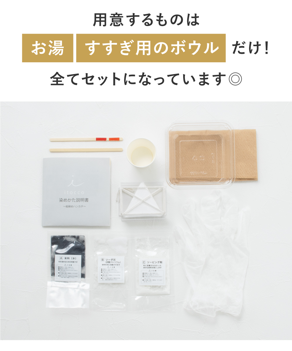 説明書、ペーパータオル、ゴム手袋、紙コップ、染料、ソーダ灰、温度計、かきまぜ棒、透明の容器、板締めのハンカチ、ソーピング剤