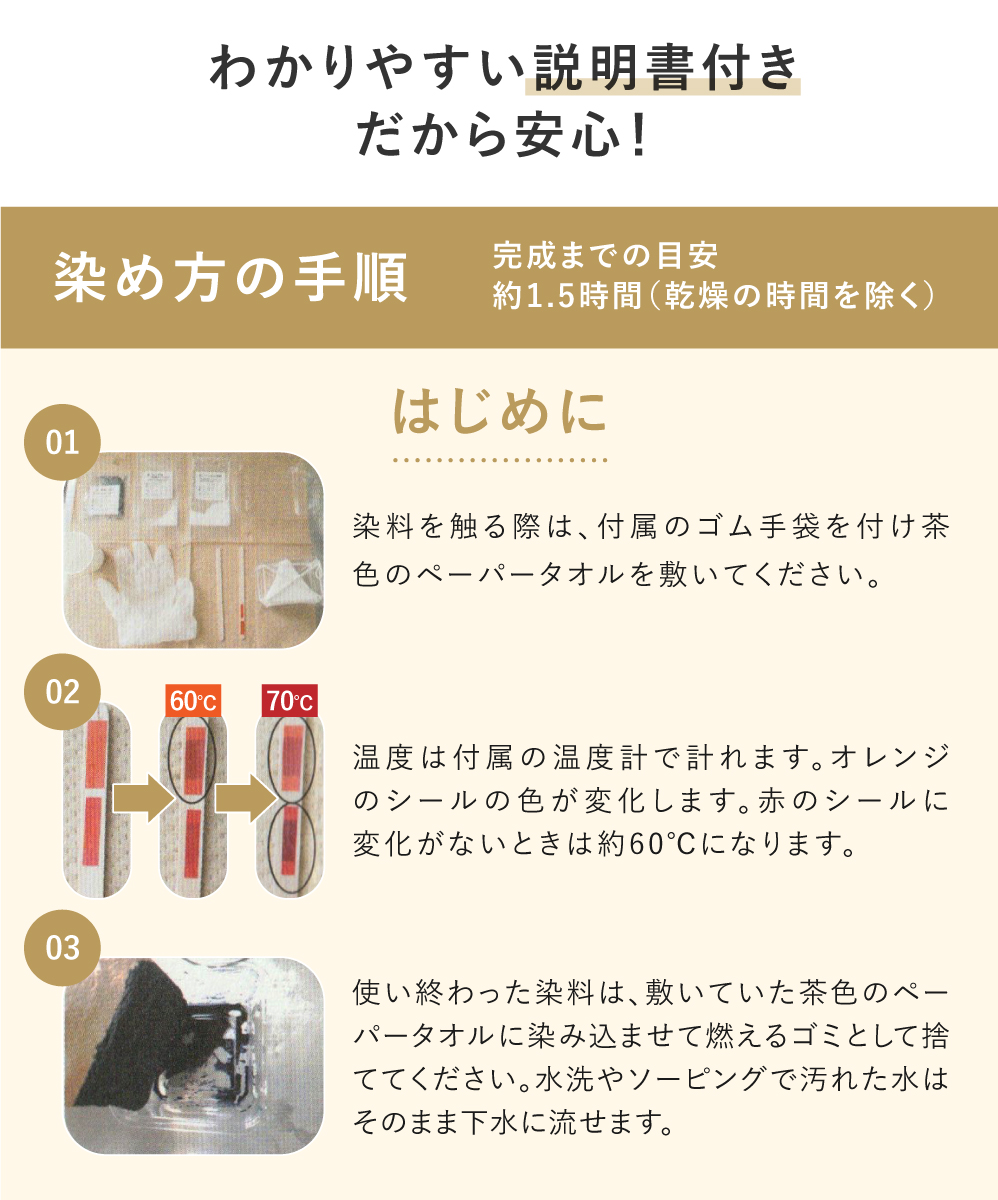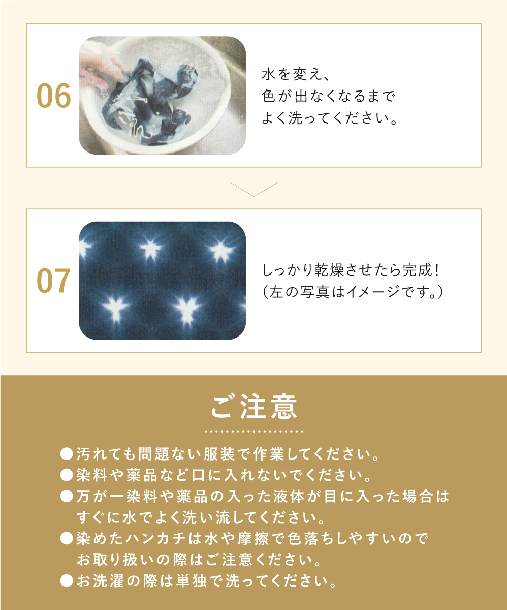 ※製品の性質上、染色後は水濡れや摩擦により色落ち、色移りの可能性がございます。お取り扱いにご注意ください。