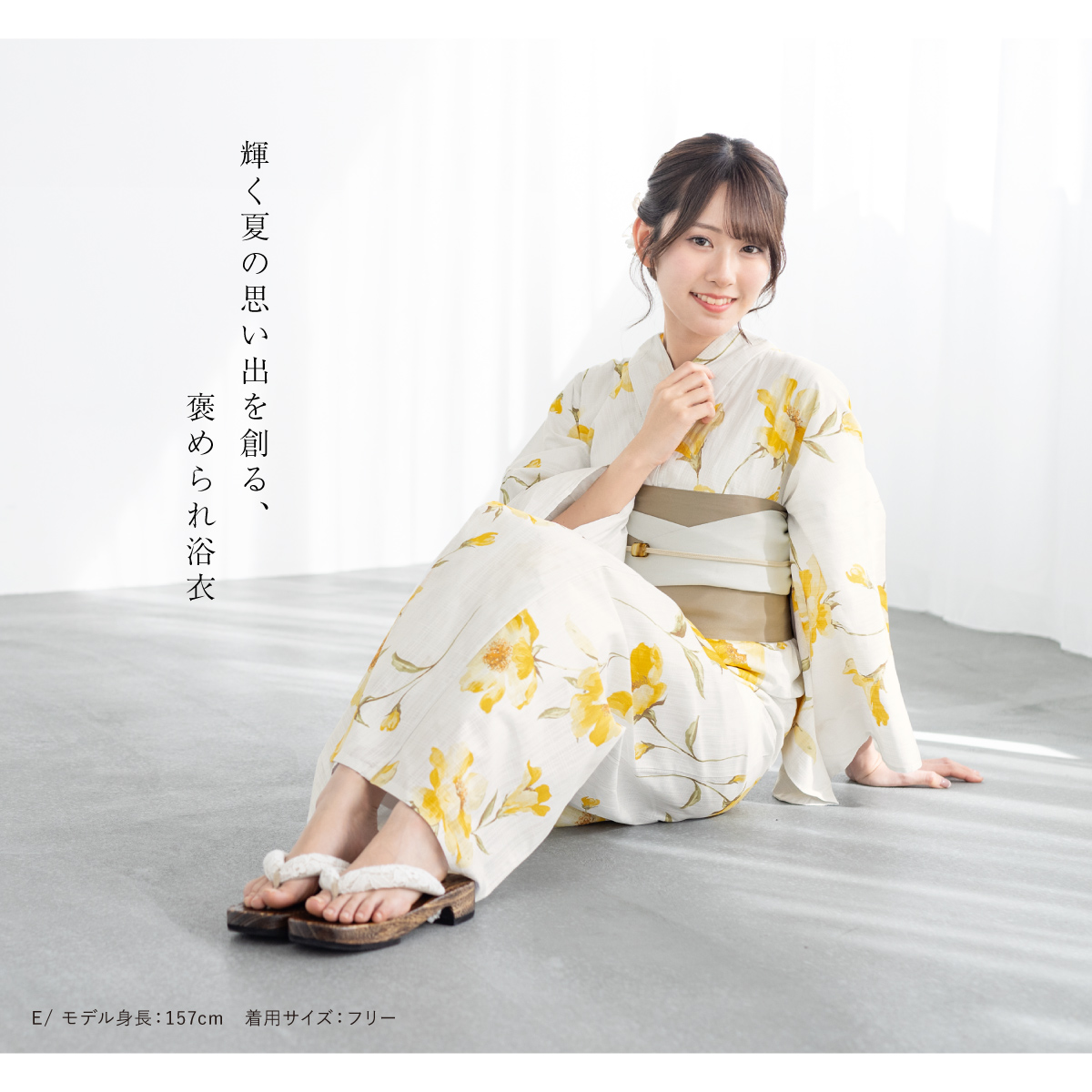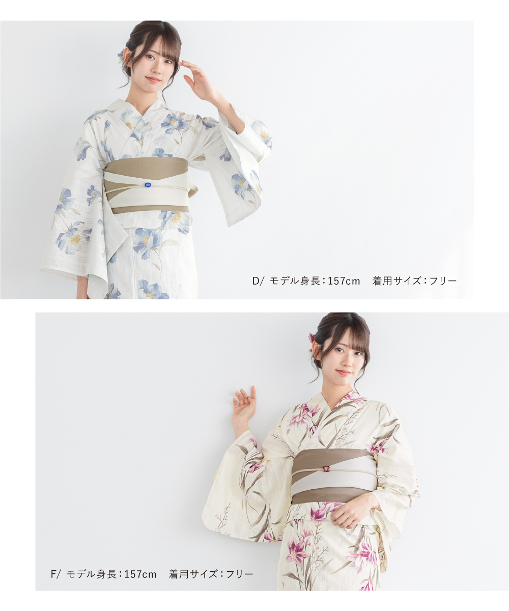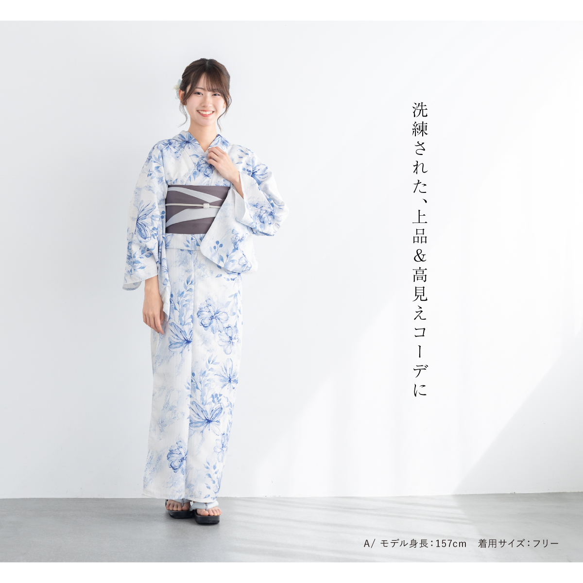 コーディネート済みの浴衣2点セットです。生地は柔らかい肌触りとふわりとした質感のポリエステル100%と、柔らかい肌触りと吸湿性に優れた綿100%です。お祭りや花火大会など夏のお出かけの際、清涼感のある着心地が続きます。仕立て上がりですので、お届け後すぐにお召しいただけます。帯は、体に巻いて後ろで結んでいただくタイプの帯となります。結び方により多彩なアレンジが可能です。
