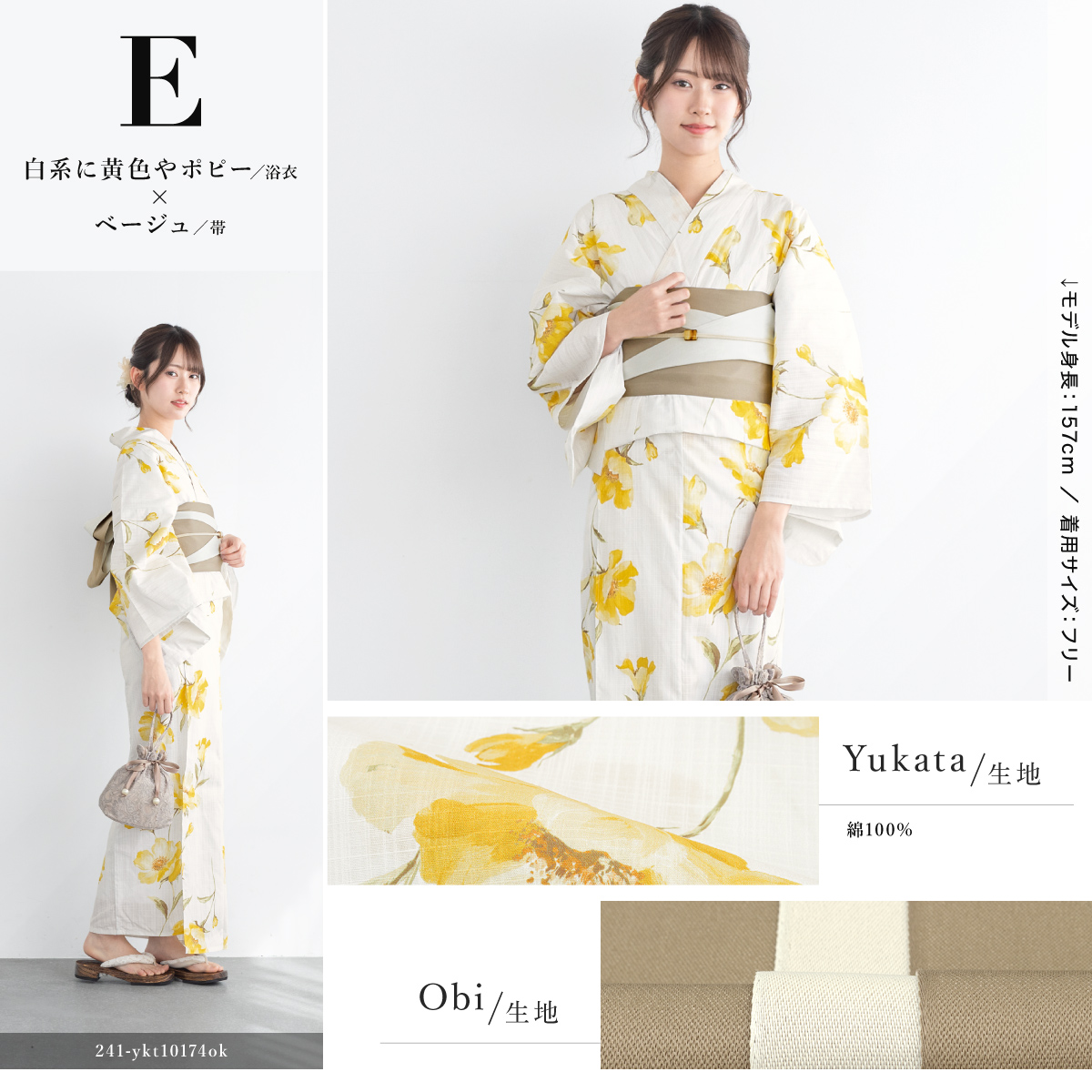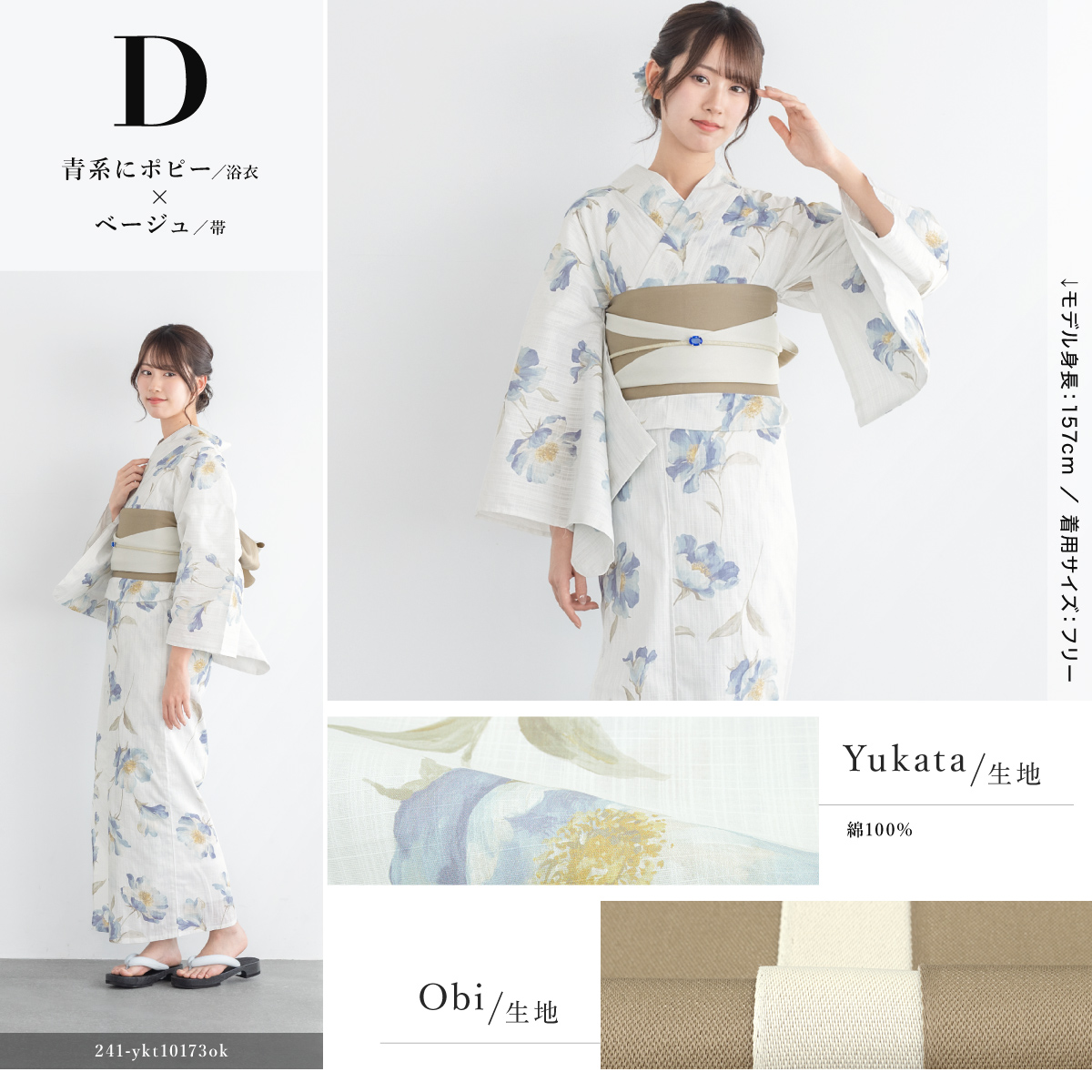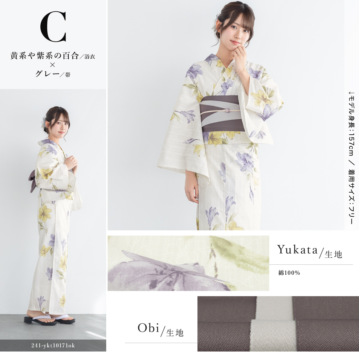 コーディネート済みの浴衣2点セットです。生地は柔らかい肌触りとふわりとした質感のポリエステル100%と、柔らかい肌触りと吸湿性に優れた綿100%です。お祭りや花火大会など夏のお出かけの際、清涼感のある着心地が続きます。仕立て上がりですので、お届け後すぐにお召しいただけます。帯は、体に巻いて後ろで結んでいただくタイプの帯となります。結び方により多彩なアレンジが可能です。