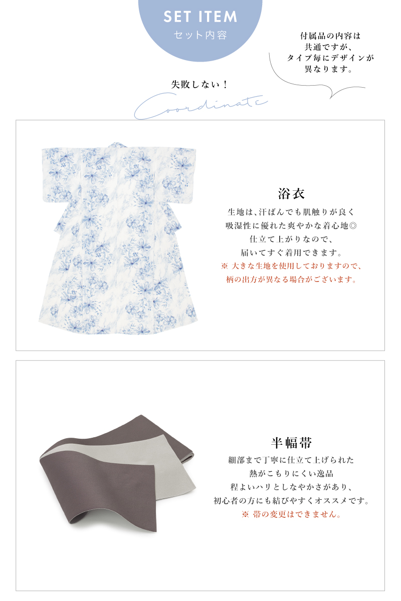 ※こちらの商品は、浴衣・帯の2点セットです。セット内容の一部変更や、それに伴う値引きは承っておりません。