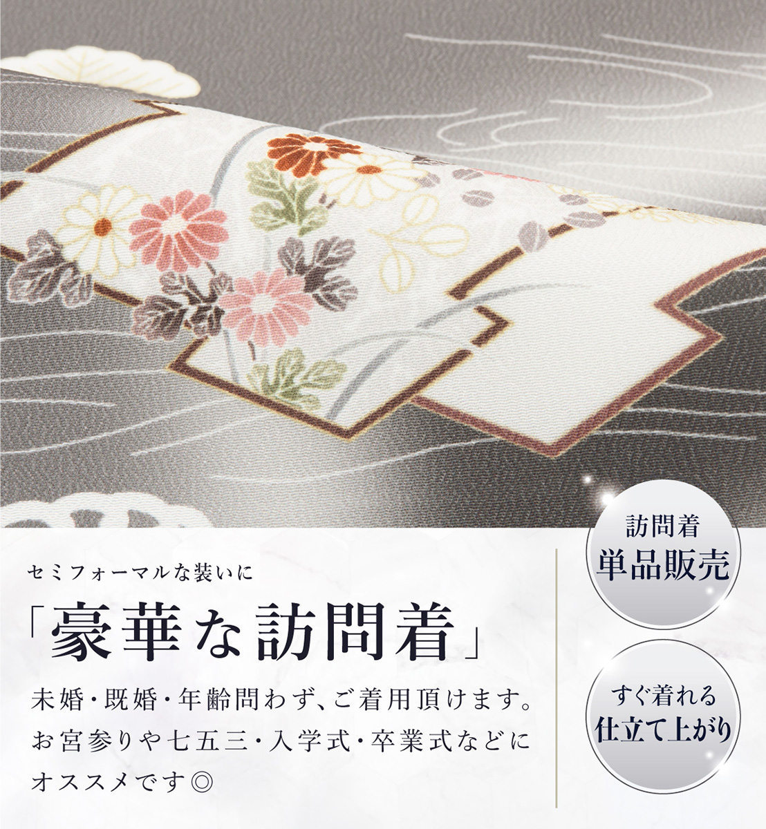 訪問着は略礼装にあたります。初詣や年末年始のご挨拶やお子様の七五三などの晴れの日にお召しいただけます。また、お友達や同僚の披露宴だけでなく、祝賀会や茶会、観劇やクラス会、他家への訪問まで、フォーマルからセミフォーマルなシーンに是非ご活用ください。合わせる袋帯で年齢問わず長くご愛用いただける品です。高級感溢れる訪問着で上質な和装をお楽しみください。