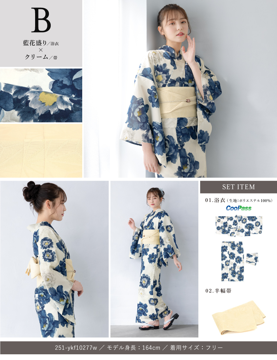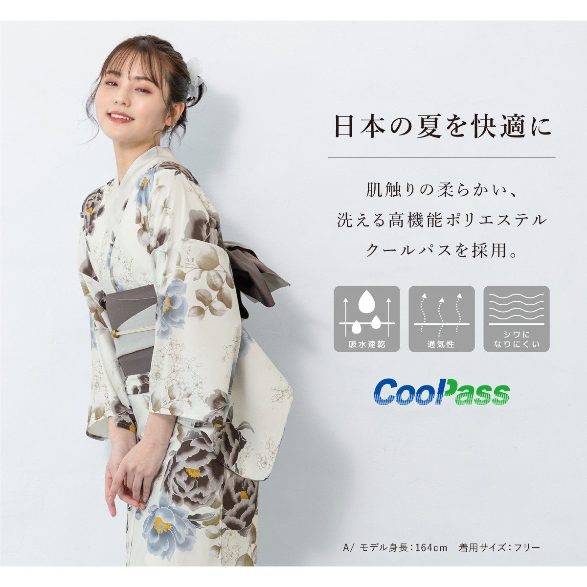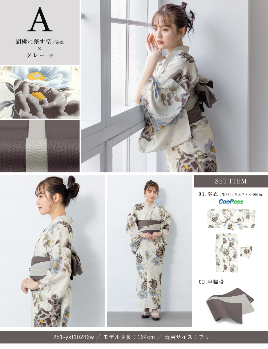 コーディネート済みのセパレート浴衣3点セットです。生地は変わり織りで、ひんやりとした肌触りで、吸汗性と速乾性の繊維のCoolPassを使用しています。適度な透け感と軽さで、熱気や湿気をすっと逃がしてくれます。お祭りや花火大会など夏のお出かけの際、清涼感のある着心地が続きます。