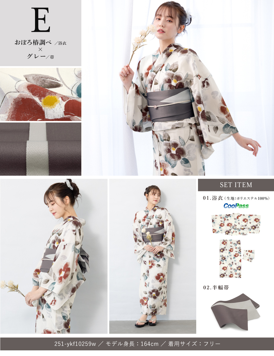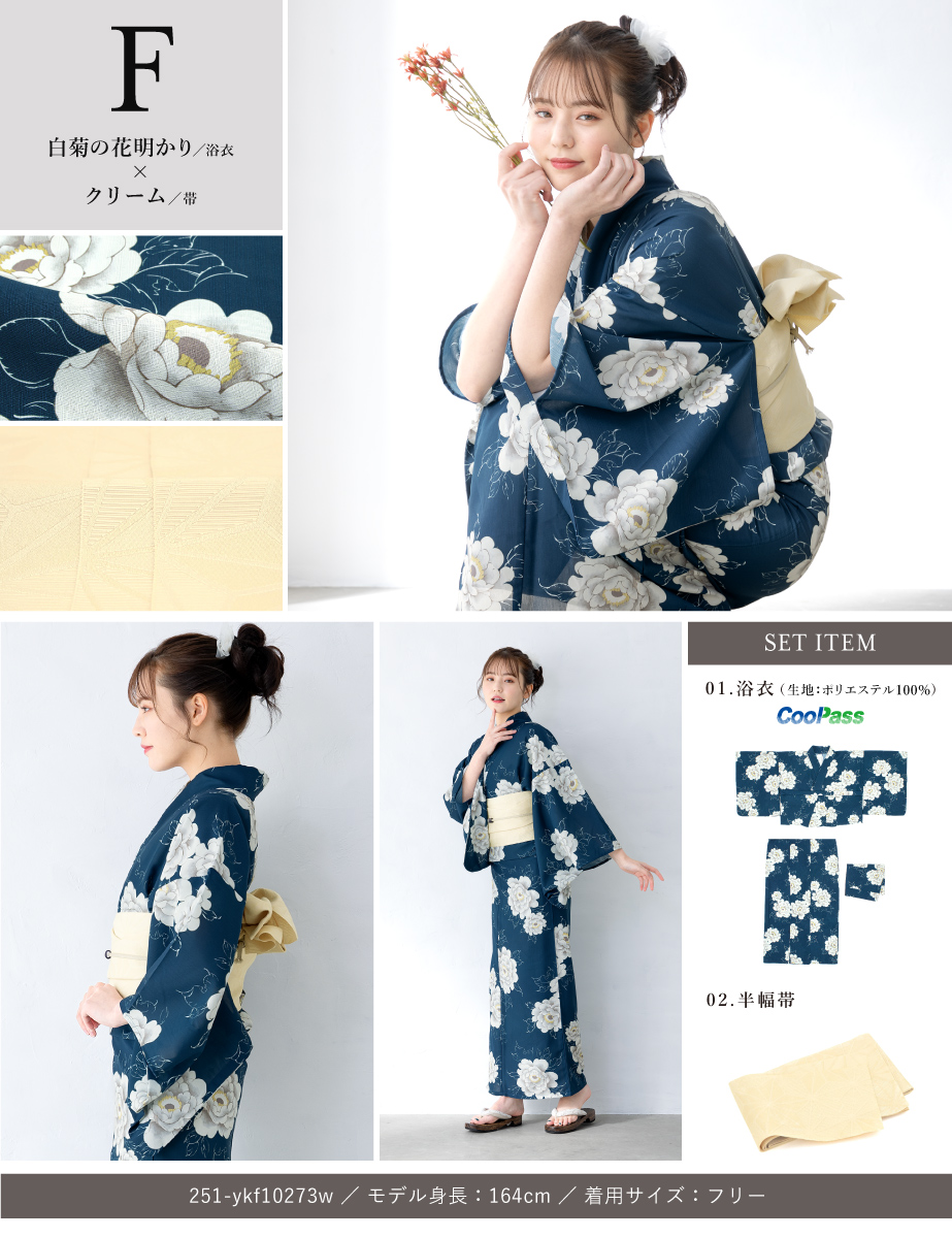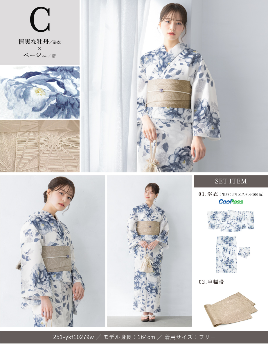 コーディネート済みのセパレート浴衣3点セットです。生地は変わり織りで、ひんやりとした肌触りで、吸汗性と速乾性の繊維のCoolPassを使用しています。適度な透け感と軽さで、熱気や湿気をすっと逃がしてくれます。お祭りや花火大会など夏のお出かけの際、清涼感のある着心地が続きます。