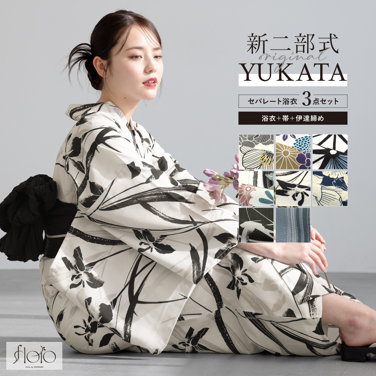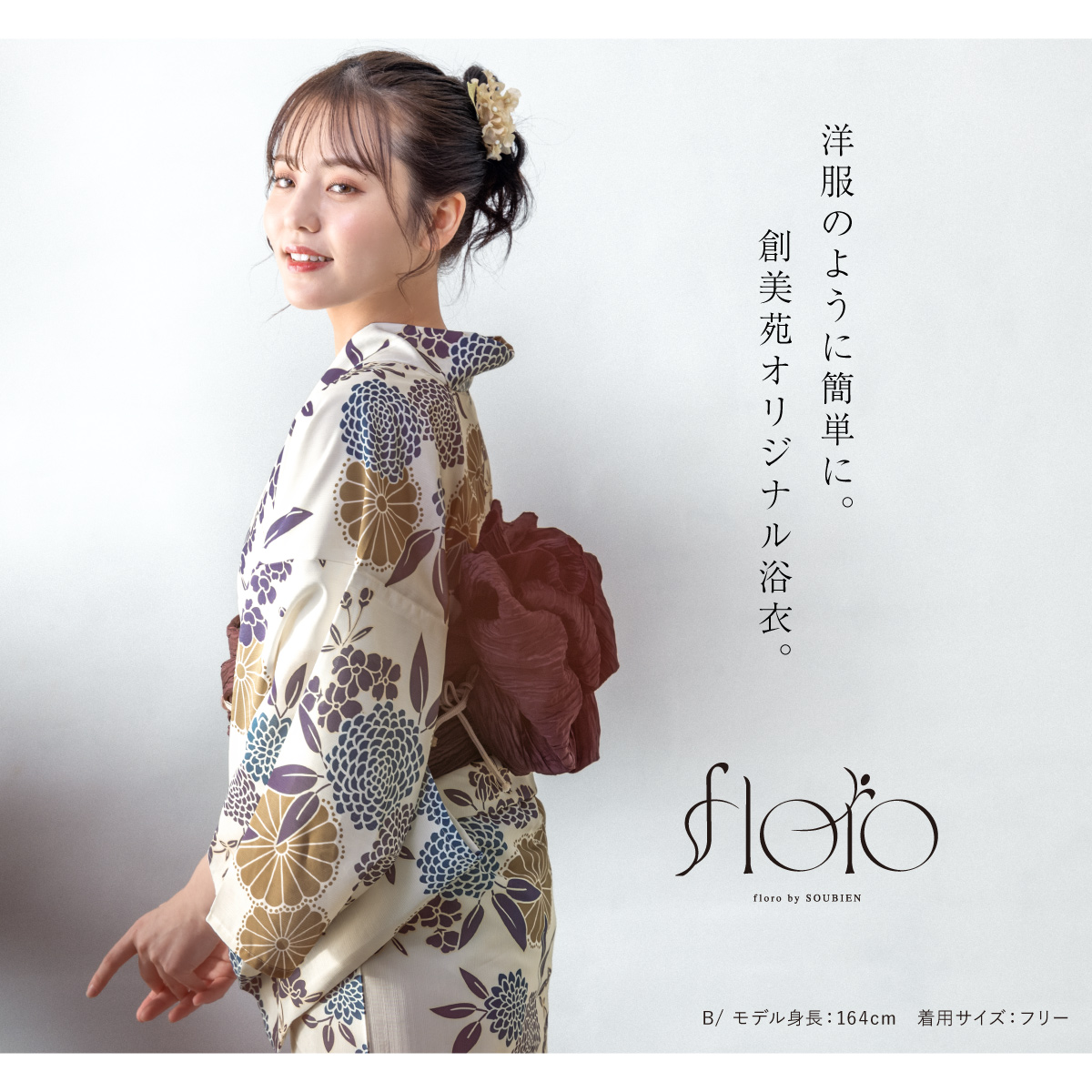 SOUBIENのプライベートブランド『floro by SOUBIEN』(フローロ)の浴衣を合わせた華やかな浴衣セットです。『floro by SOUBIEN』は、移りゆく和装トレンドの最先端を常に追い求め「欲しい」「着てみたい」を作り出す、SOUBIENのプライベートブランドです。ジャンルや系統に縛られず、あらゆるシーンに求められる和装スタイルを展開し、今流行りを押さえ、和装のお洒落を魅せたいという想いをコンセプトに真心を込めて作りました。