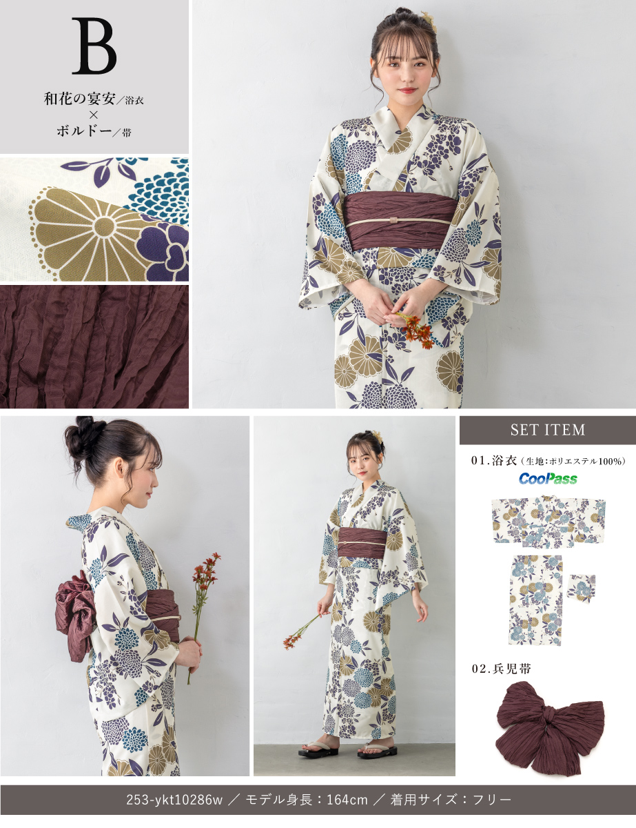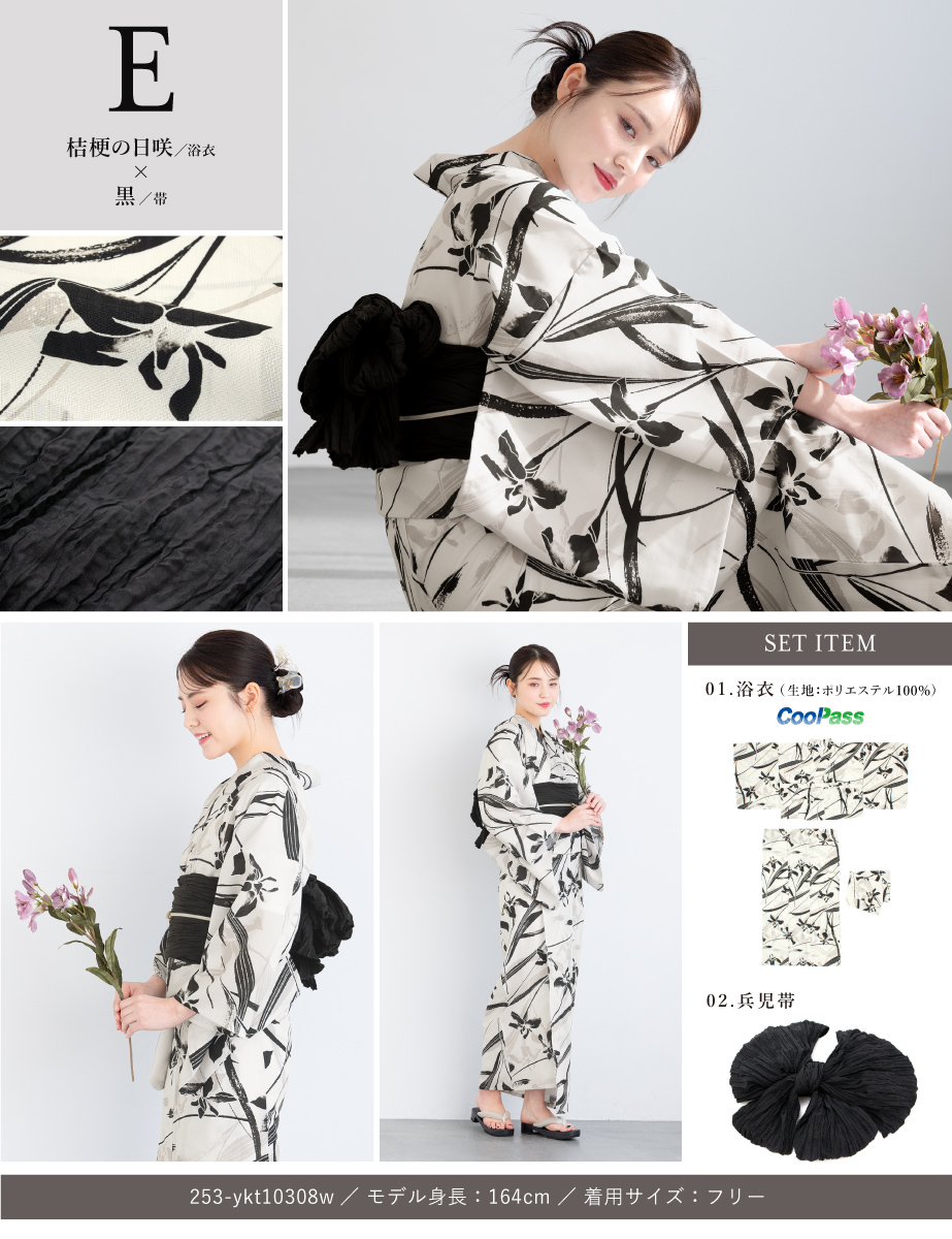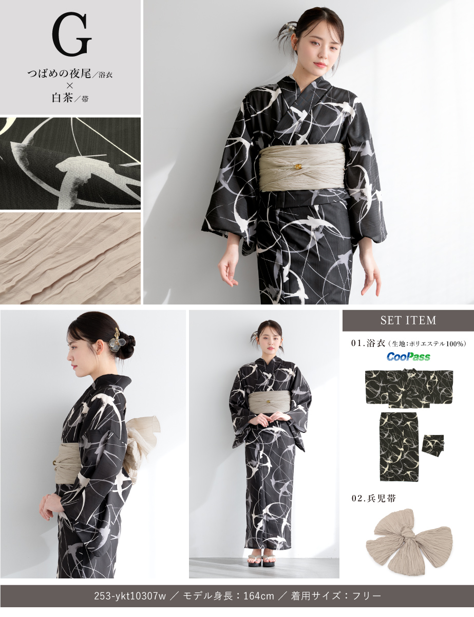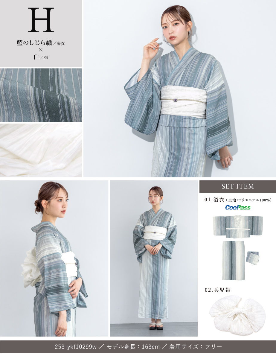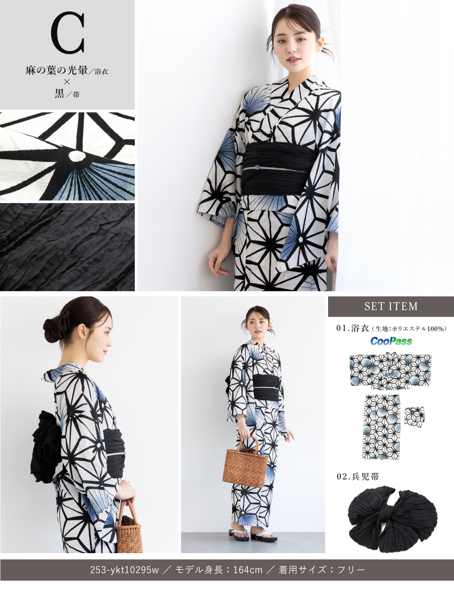 コーディネート済みのセパレート浴衣3点セットです。生地は変わり織りで、ひんやりとした肌触りで、吸汗性と速乾性の繊維のCoolPassを使用しています。適度な透け感と軽さで、熱気や湿気をすっと逃がしてくれます。お祭りや花火大会など夏のお出かけの際、清涼感のある着心地が続きます。