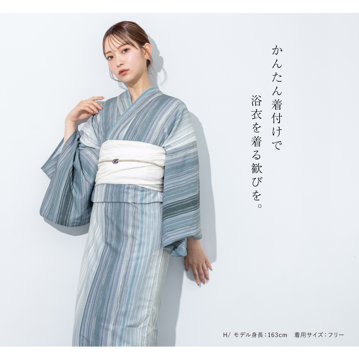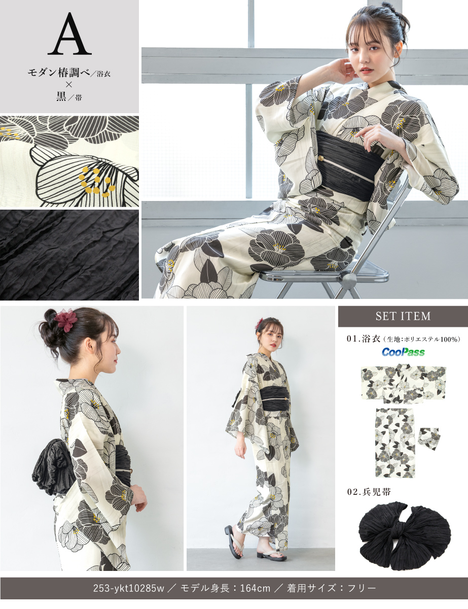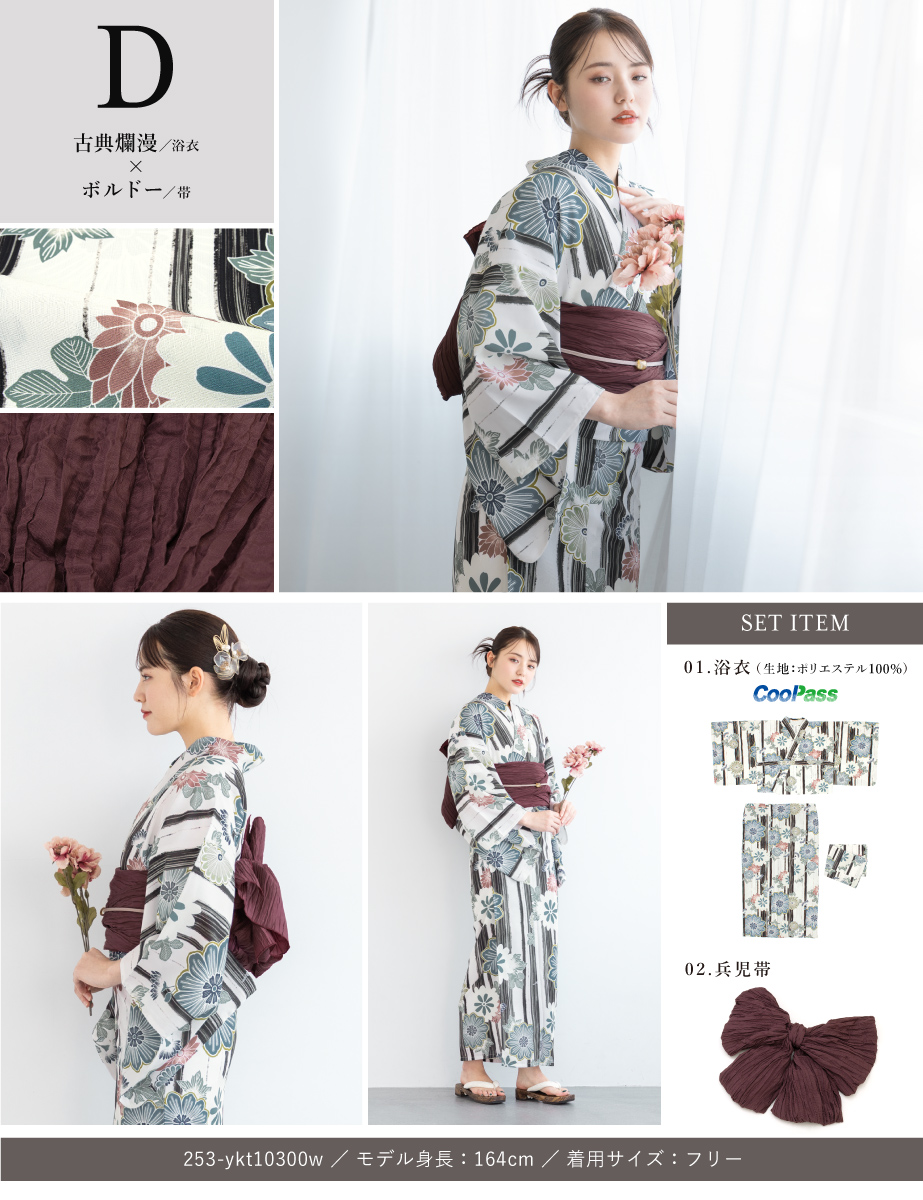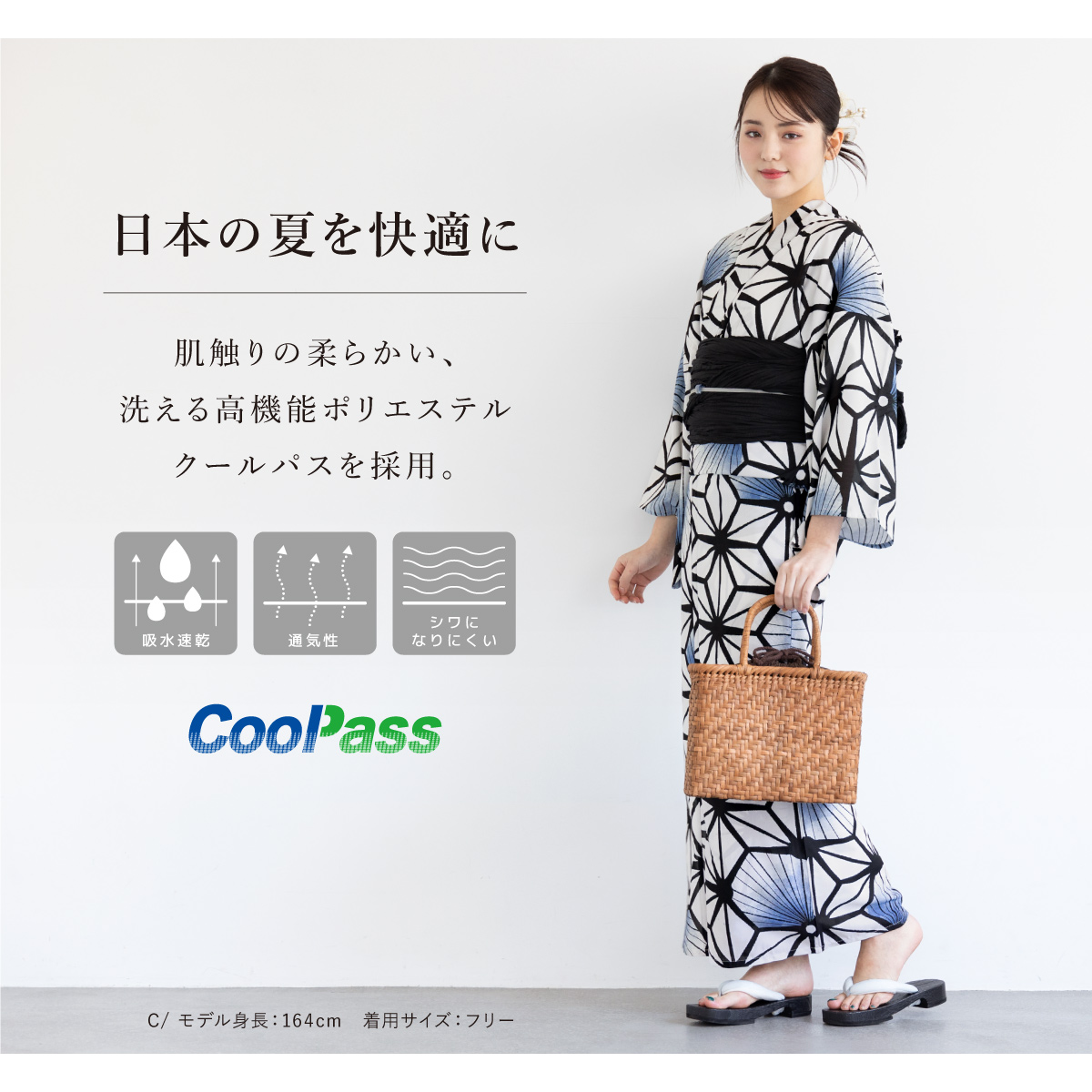 コーディネート済みのセパレート浴衣3点セットです。生地は変わり織りで、ひんやりとした肌触りで、吸汗性と速乾性の繊維のCoolPassを使用しています。適度な透け感と軽さで、熱気や湿気をすっと逃がしてくれます。お祭りや花火大会など夏のお出かけの際、清涼感のある着心地が続きます。