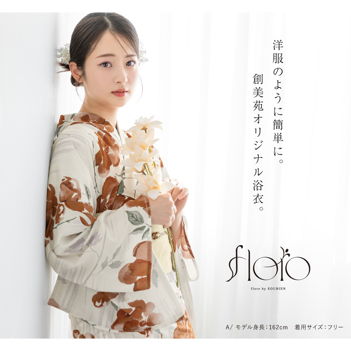 SOUBIENのプライベートブランド『floro by SOUBIEN』(フローロ)の浴衣を合わせた華やかな浴衣セットです。『floro by SOUBIEN』(フローロ)は、移りゆく和装トレンドの最先端を常に追い求め「欲しい」「着てみたい」を作り出す、SOUBIENのプライベートブランドです。ジャンルや系統に縛られず、あらゆるシーンに求められる和装スタイルを展開し、今流行りを押さえ、和装のお洒落を魅せたいという想いをコンセプトに真心を込めて作りました。