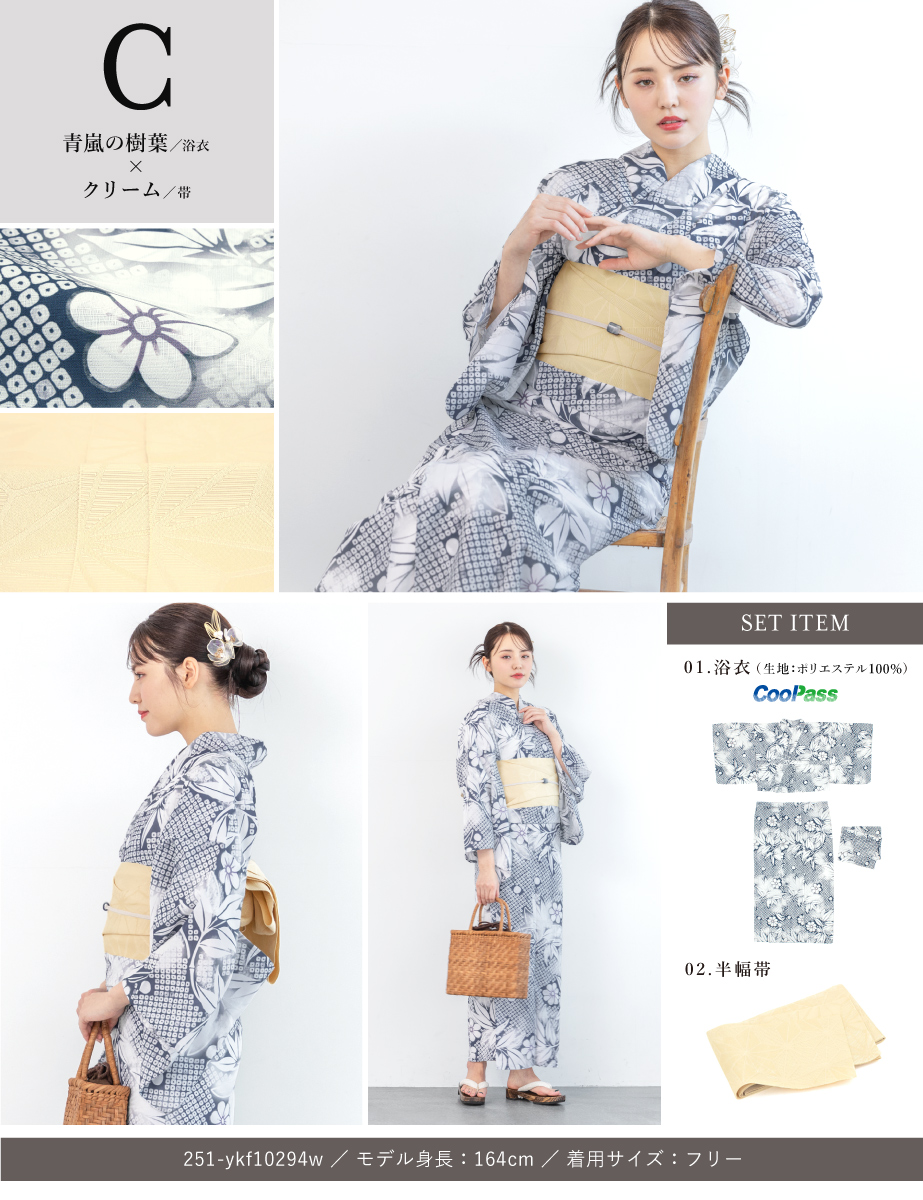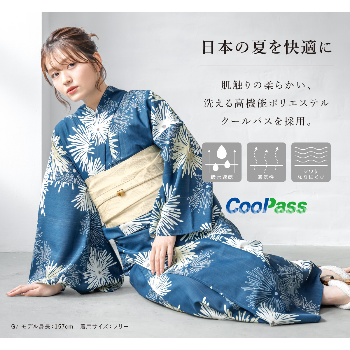 コーディネート済みのセパレート浴衣3点セットです。生地は変わり織りで、ひんやりとした肌触りで、吸汗性と速乾性の繊維のCoolPassを使用しています。適度な透け感と軽さで、熱気や湿気をすっと逃がしてくれます。お祭りや花火大会など夏のお出かけの際、清涼感のある着心地が続きます。