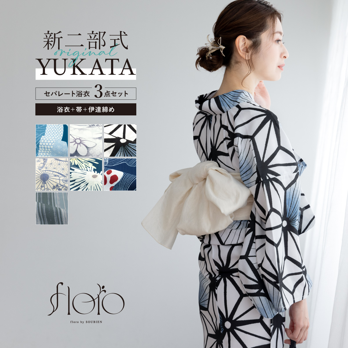 SOUBIENのプライベートブランド『floro by SOUBIEN』(フローロ)の浴衣を合わせた華やかな浴衣セットです。『floro by SOUBIEN』は、移りゆく和装トレンドの最先端を常に追い求め「欲しい」「着てみたい」を作り出す、SOUBIENのプライベートブランドです。ジャンルや系統に縛られず、あらゆるシーンに求められる和装スタイルを展開し、今流行りを押さえ、和装のお洒落を魅せたいという想いをコンセプトに真心を込めて作りました。