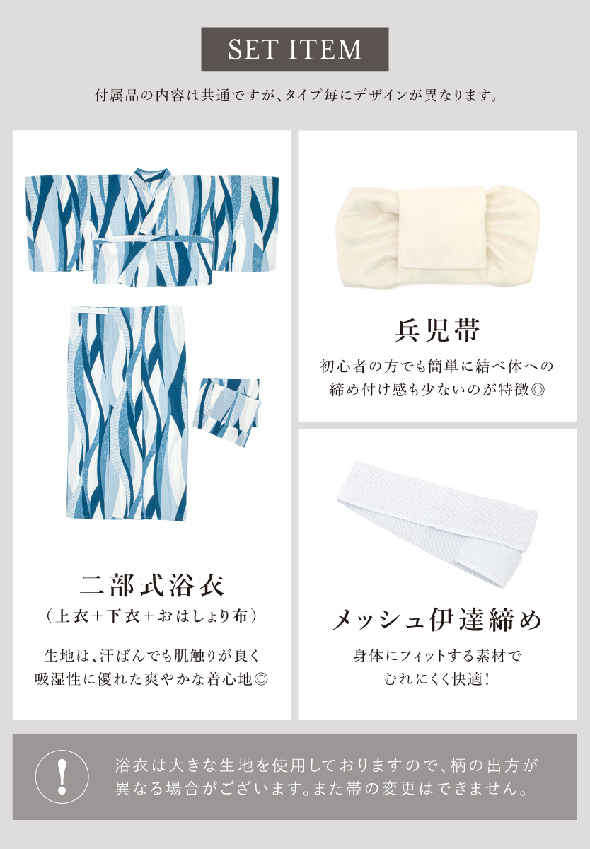 二部式浴衣(上衣+下衣+おはしょり布)、帯、伊達締め