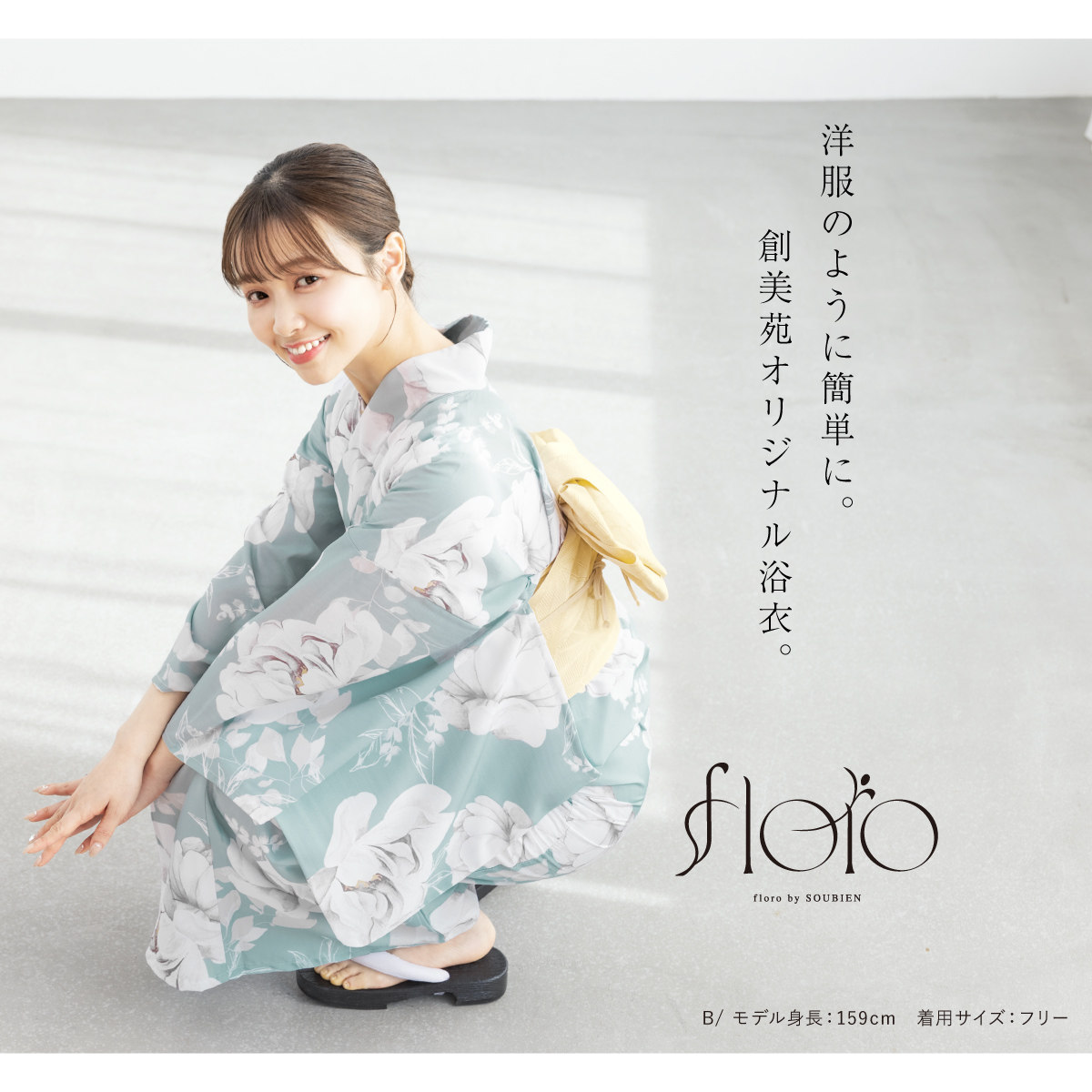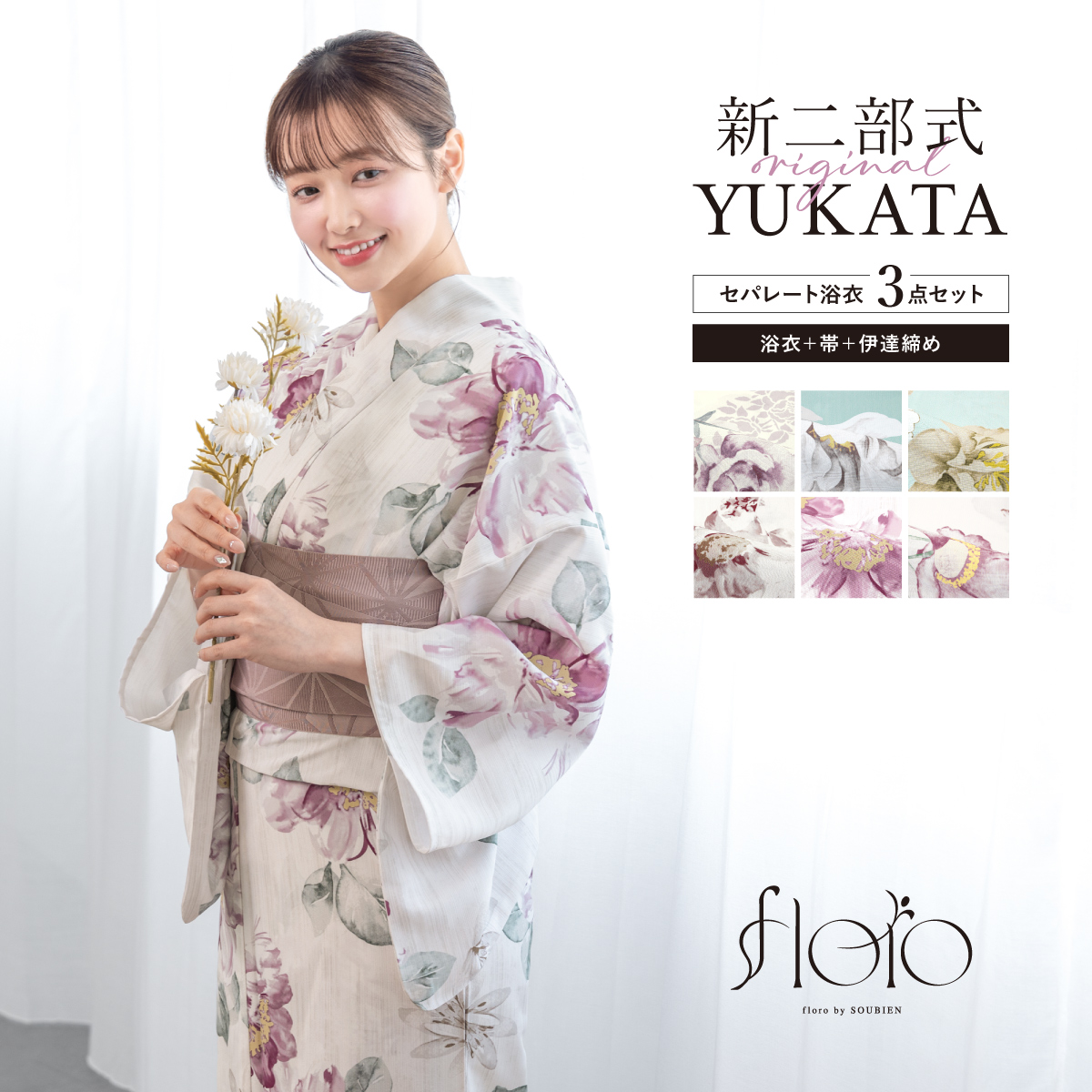 SOUBIENのプライベートブランド『floro by SOUBIEN』(フローロ)の浴衣を合わせた華やかな浴衣セットです。『floro by SOUBIEN』(フローロ)は、移りゆく和装トレンドの最先端を常に追い求め「欲しい」「着てみたい」を作り出す、SOUBIENのプライベートブランドです。ジャンルや系統に縛られず、あらゆるシーンに求められる和装スタイルを展開し、今流行りを押さえ、和装のお洒落を魅せたいという想いをコンセプトに真心を込めて作りました。