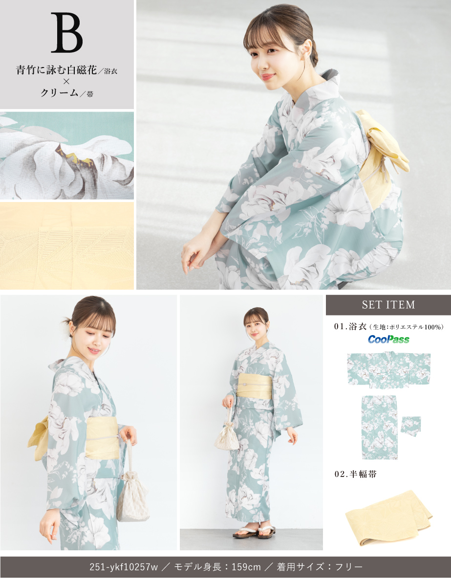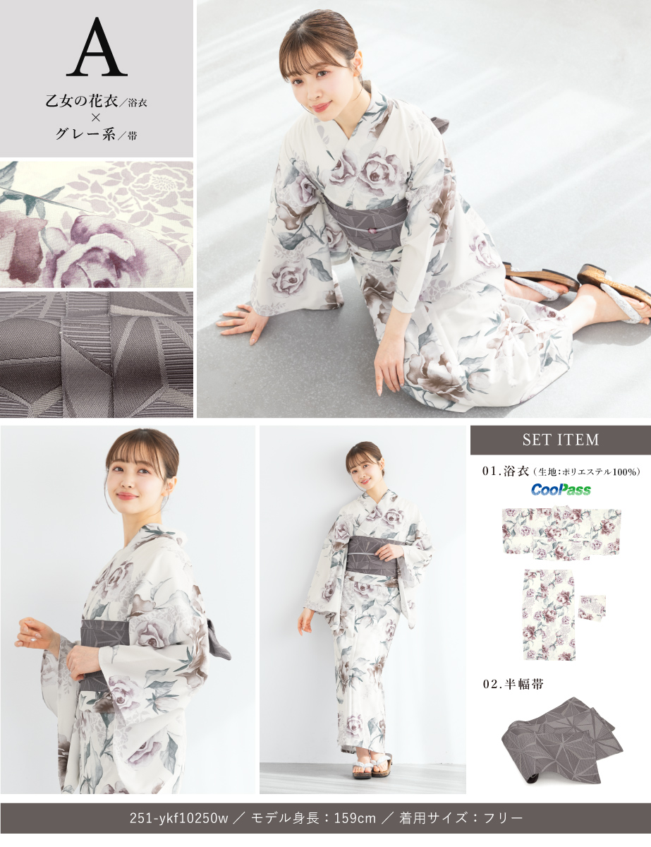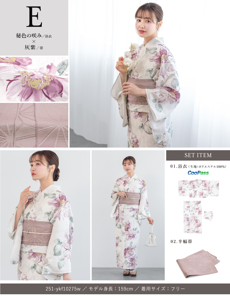 コーディネート済みのセパレート浴衣3点セットです。生地は変わり織りで、ひんやりとした肌触りで、吸汗性と速乾性の繊維のCoolPassを使用しています。適度な透け感と軽さで、熱気や湿気をすっと逃がしてくれます。お祭りや花火大会など夏のお出かけの際、清涼感のある着心地が続きます。