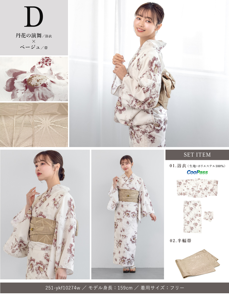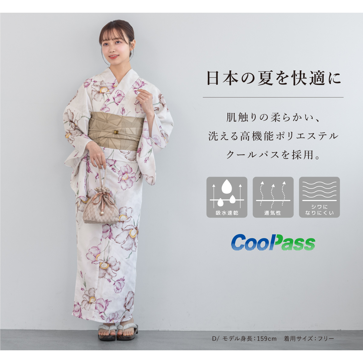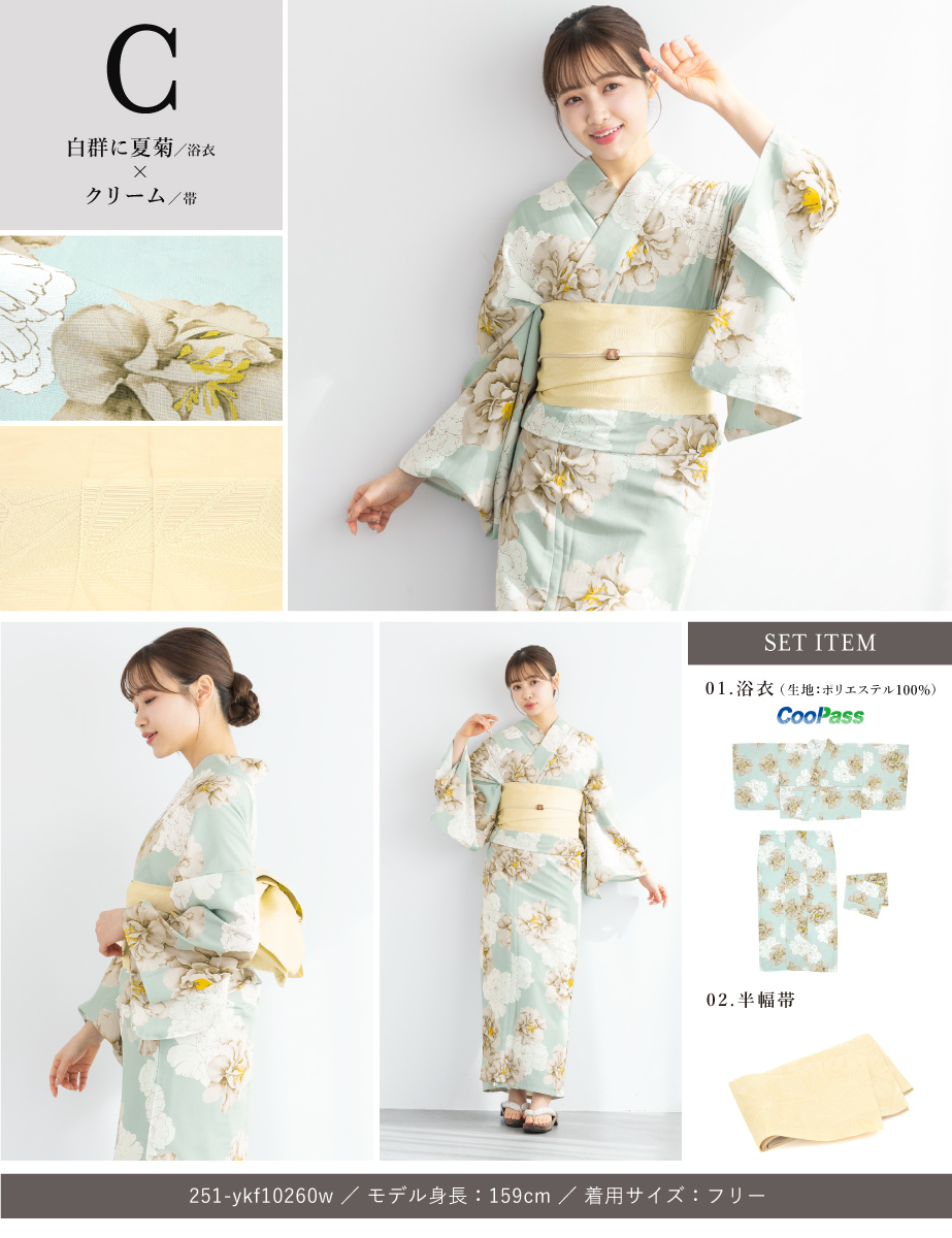 コーディネート済みのセパレート浴衣3点セットです。生地は変わり織りで、ひんやりとした肌触りで、吸汗性と速乾性の繊維のCoolPassを使用しています。適度な透け感と軽さで、熱気や湿気をすっと逃がしてくれます。お祭りや花火大会など夏のお出かけの際、清涼感のある着心地が続きます。