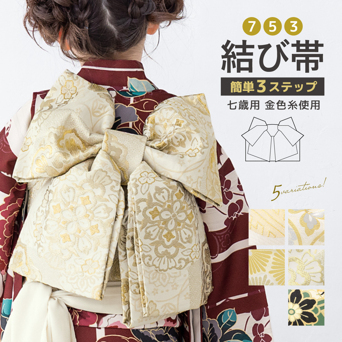 七五三 7歳 結び帯 作り帯 簡単 女の子 子供 礼装 リボン文庫結び ホワイト ベージュ ゴールド グリーン 和柄 古典柄 レトロモダン 着物 四つ身 帯 単品 初心者でも 販売 購入 送料無料