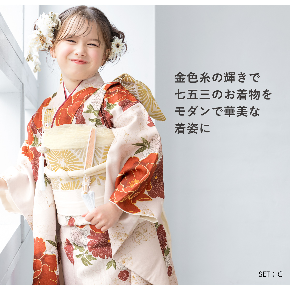 7歳用のフォーマルな着物によくお似合いです。七五三やお祝いをはじめ、結婚式にお呼ばれの際にもお召しいただけます。写真館の記念撮影でも、携帯電話でのスナップ写真でも、ぱっと華やかな一枚になるように着物姿を引き立てます。